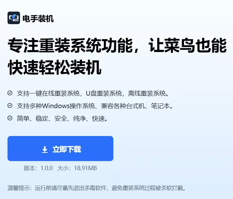 电手装机支持多种 Windows 系统,支持在线和离线重装,简单、稳定、安全、纯净、快速。