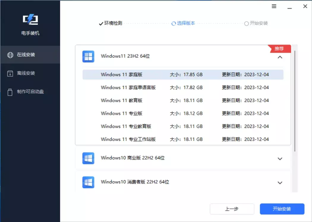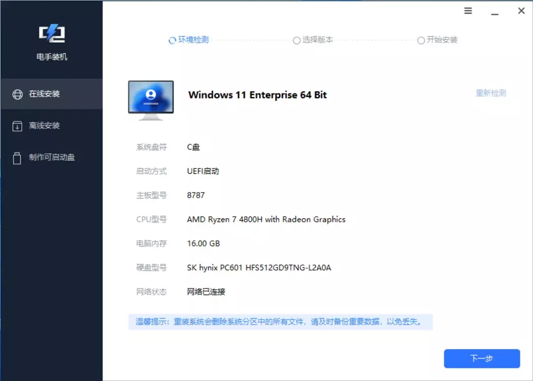 在线重装需要网络才能使用,软件会根据硬件条件推荐合适的系统版本,在线下载之后再开始安装。